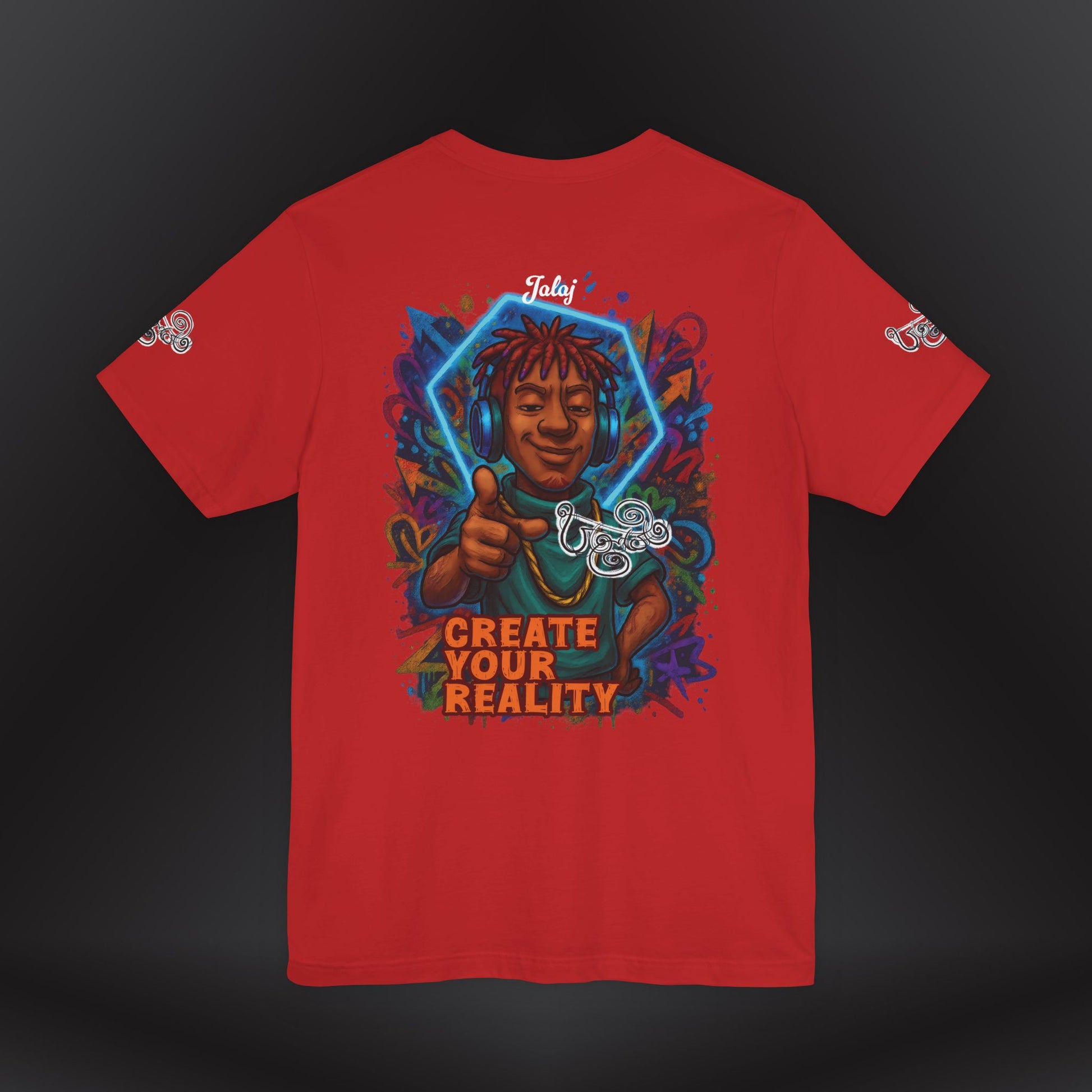 Back (Rapper): The confident Rapper, headphones on and finger pointed forward, commands presence with graffiti pops and neon energy, paired with the empowering message “CREATE YOUR REALITY.”
