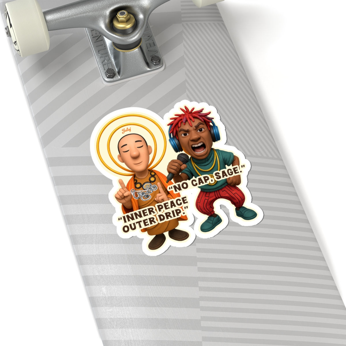 Find your zen, but make it drip. This vibrant sticker features the ultimate culture-clash duo from the animated project "Jalaj," where ancient wisdom meets modern beats.