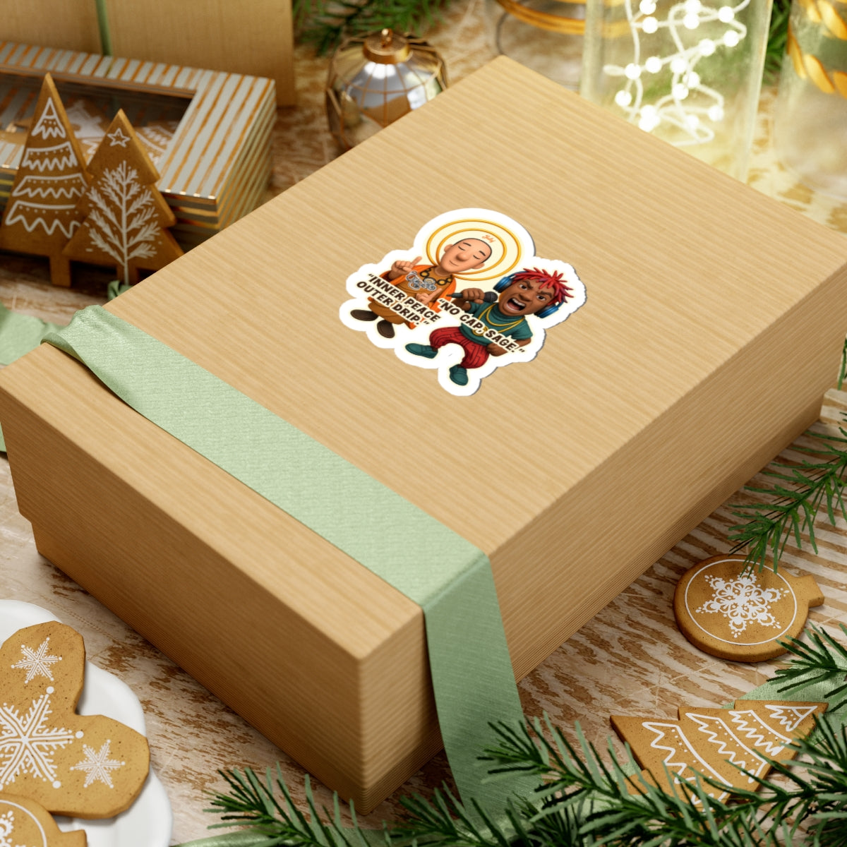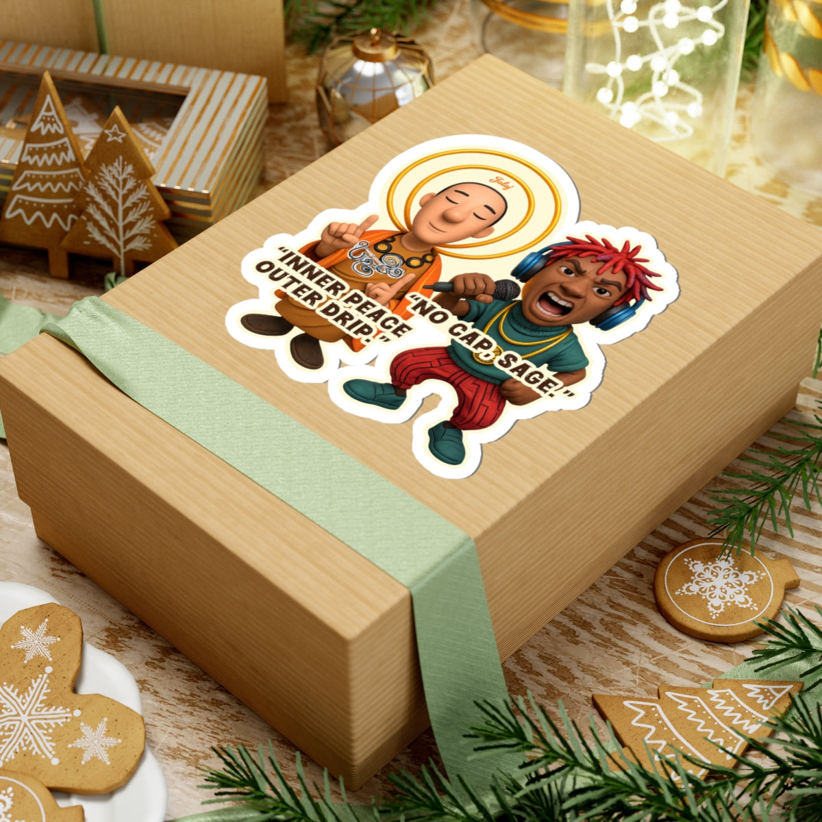 On one side, the enlightened monk shares his secret to style with the mantra, "Inner Peace Outer Drip." On the other, the high-energy rapper hypes him up with a resounding "No Cap, Sage!" It's the perfect, hilarious blend of spiritual enlightenment and hip-hop authenticity.