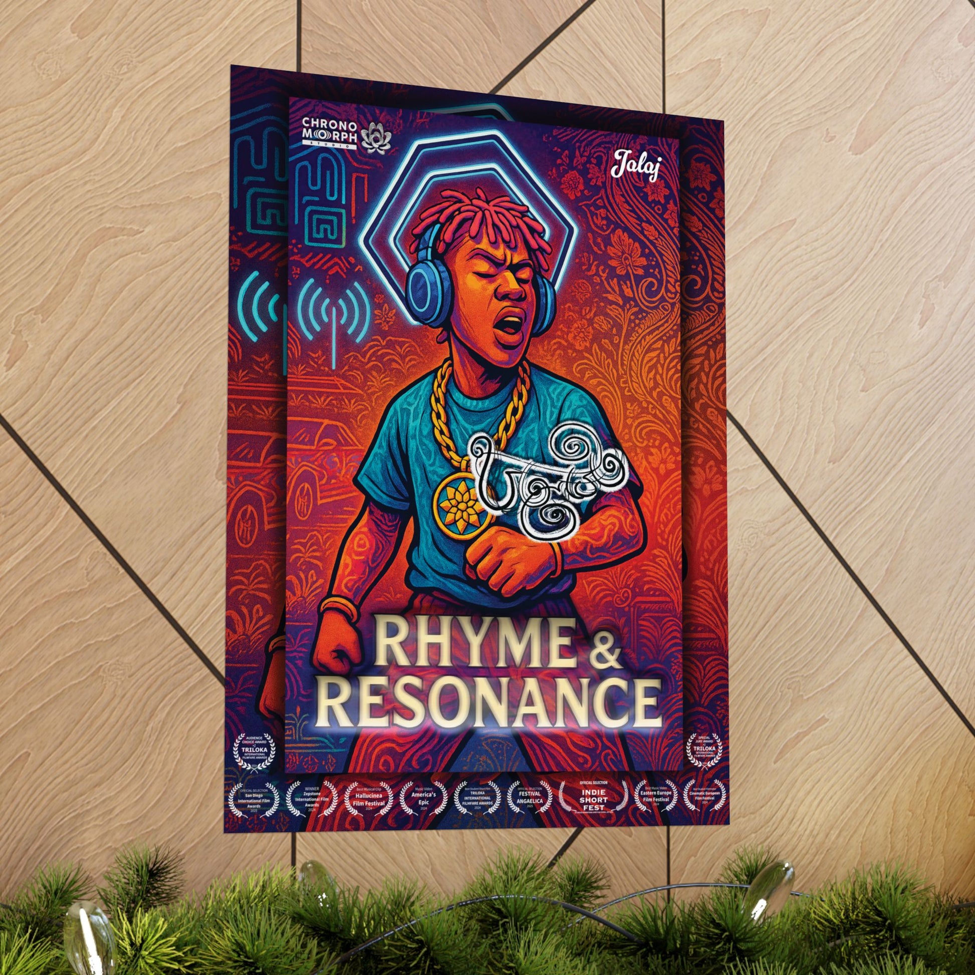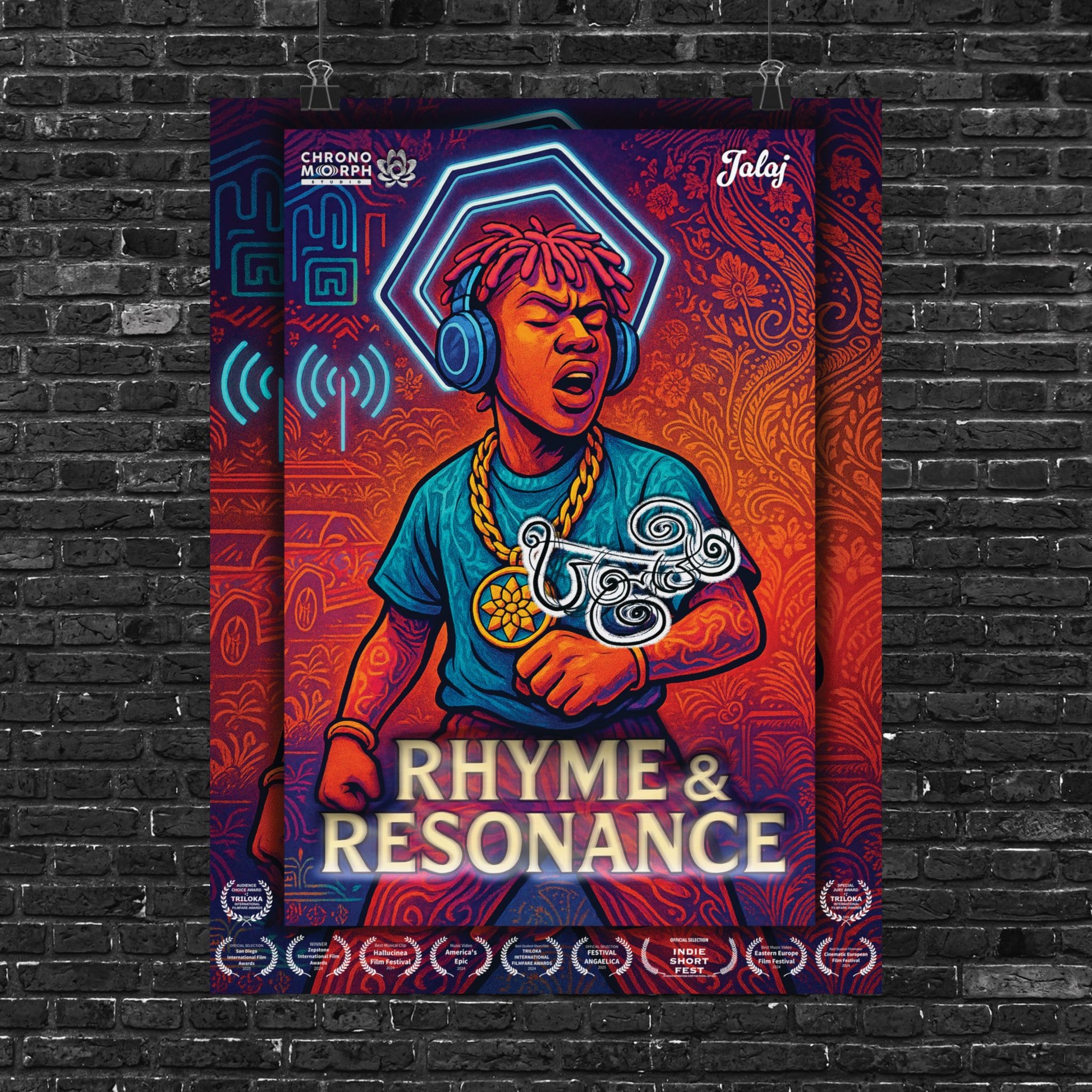 Feel the beat with the official "Rhyme & Resonance" poster from JALAJ by Chronomorph Studio. This dynamic design highlights the raw energy of the Rapper, a key figure in the award-winning animated music video. Set against a backdrop that blends traditional patterns with neon futurism, this piece celebrates the power of music to bridge worlds. Showcased at 11 international festivals, this vibrant poster is a collectible tribute to the film's unique sound and style.